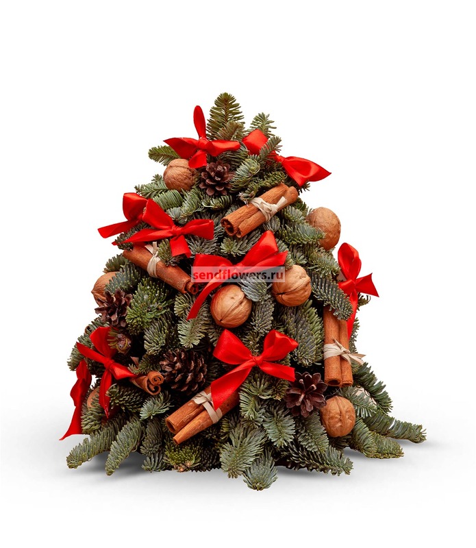 Состав: Оазис кирпич (6), Лапник (5), Лента натуральная (10), Шишка натуральная (20), Кашпо (пластик) (1), Корица (25), Грецкий орех (30)